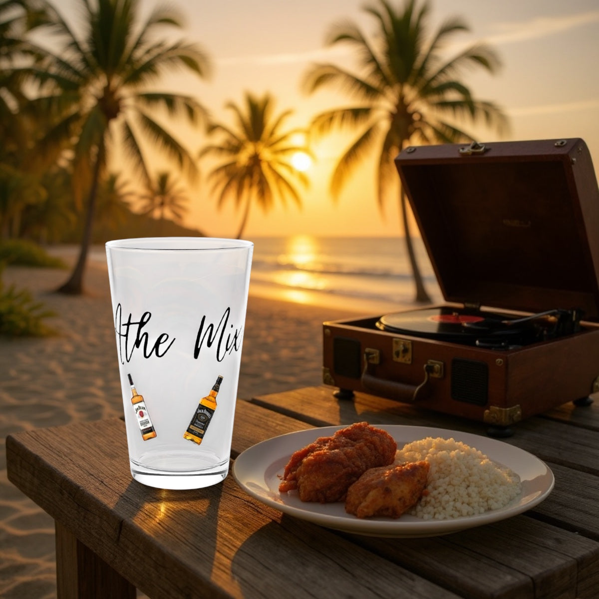 Add a splash of style to your barware collection with this unique whiskey glass. Featuring bold script that reads “Athe Mix” and detailed illustrations of two iconic bottles, this glass is perfect for anyone who loves good vibes and strong drinks!