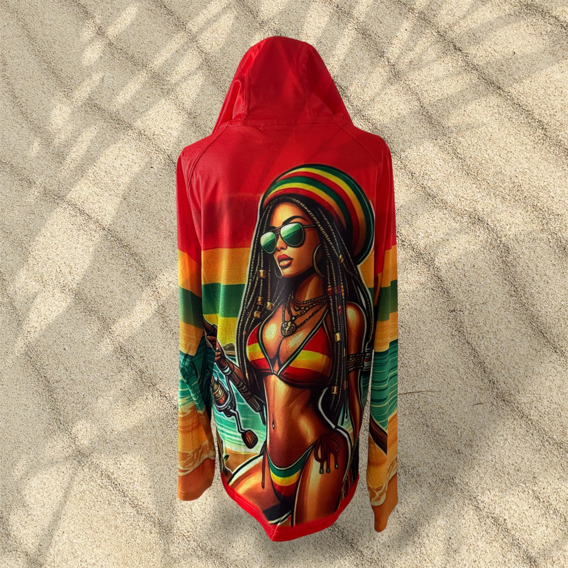 Turn heads with this bold and vibrant Rasta-inspired hoodie! Featuring a powerful design of a confident island queen in reggae colors, this piece is perfect for those who love to stand out.
